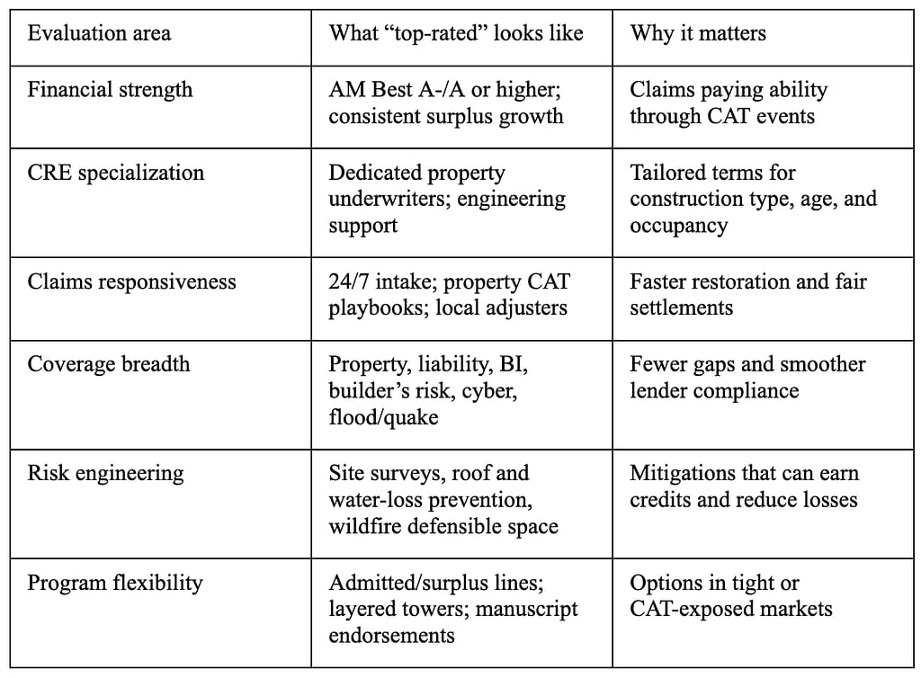 Evaluating national carriers comes down to a few nonnegotiables: financial strength (AM Best A‑ or better), dedicated CRE underwriting, rapid and fair claims handling, and a broad suite spanning property, liability, builder’s risk, equipment breakdown, cyber, and flood/quake options. Market share rankings can help identify stable leaders with deep capacity (industry rankings overview).