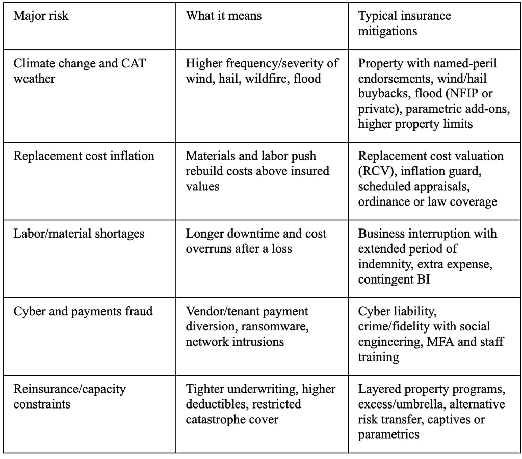 - Reassess policy limits and valuation bases to current replacement costs and recent capital improvements; update appraisals and inflation guard annually (CBIZ outlook).